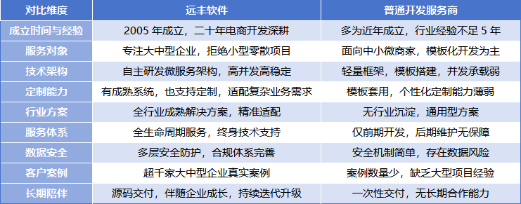 通过对比可见,远丰软件在技术实力、定制能力、行业经验、服务保障等方面,均远超普通开发服务商,更能满足大中型企业网上购物商城APP开发的核心需求。